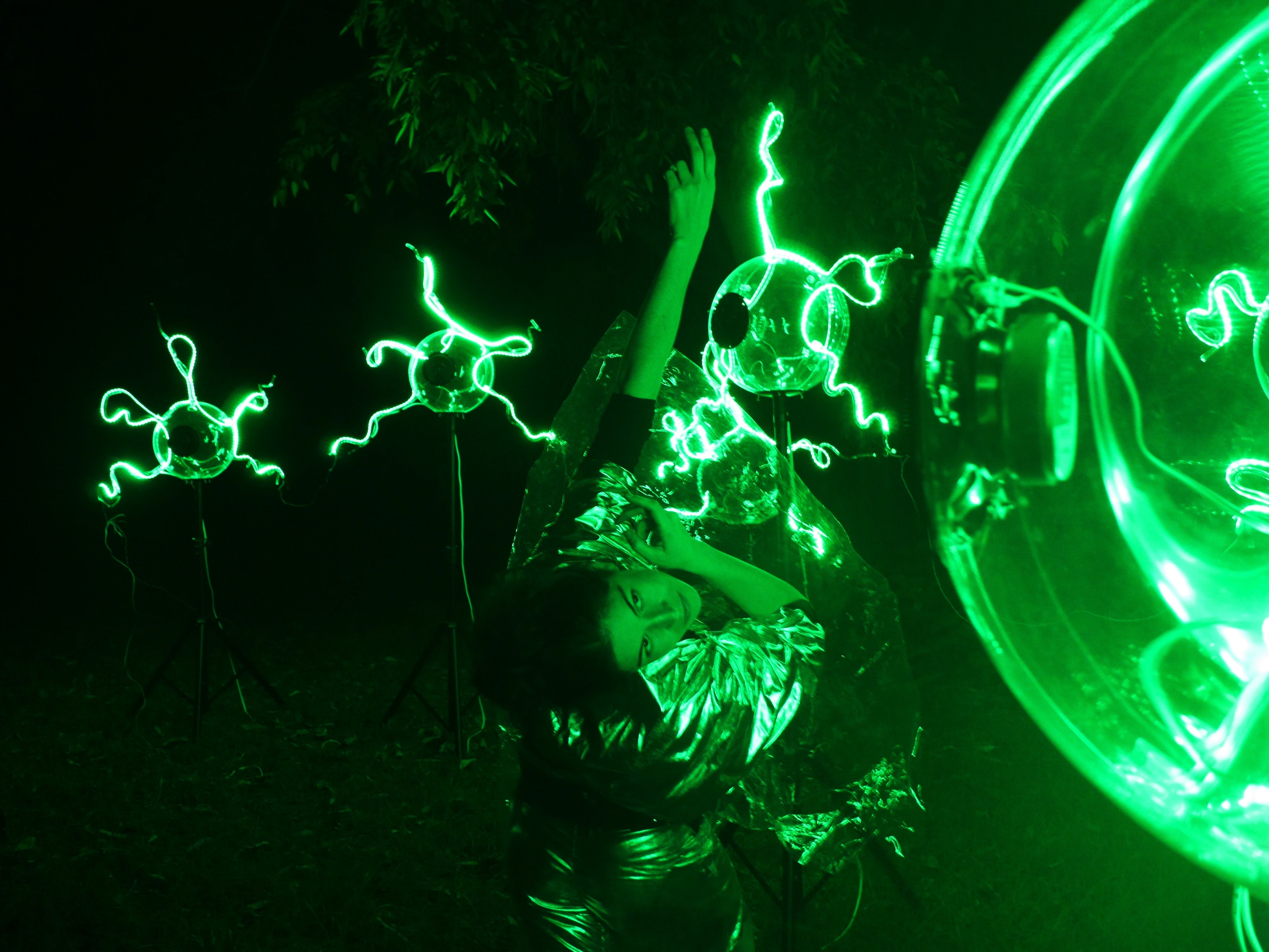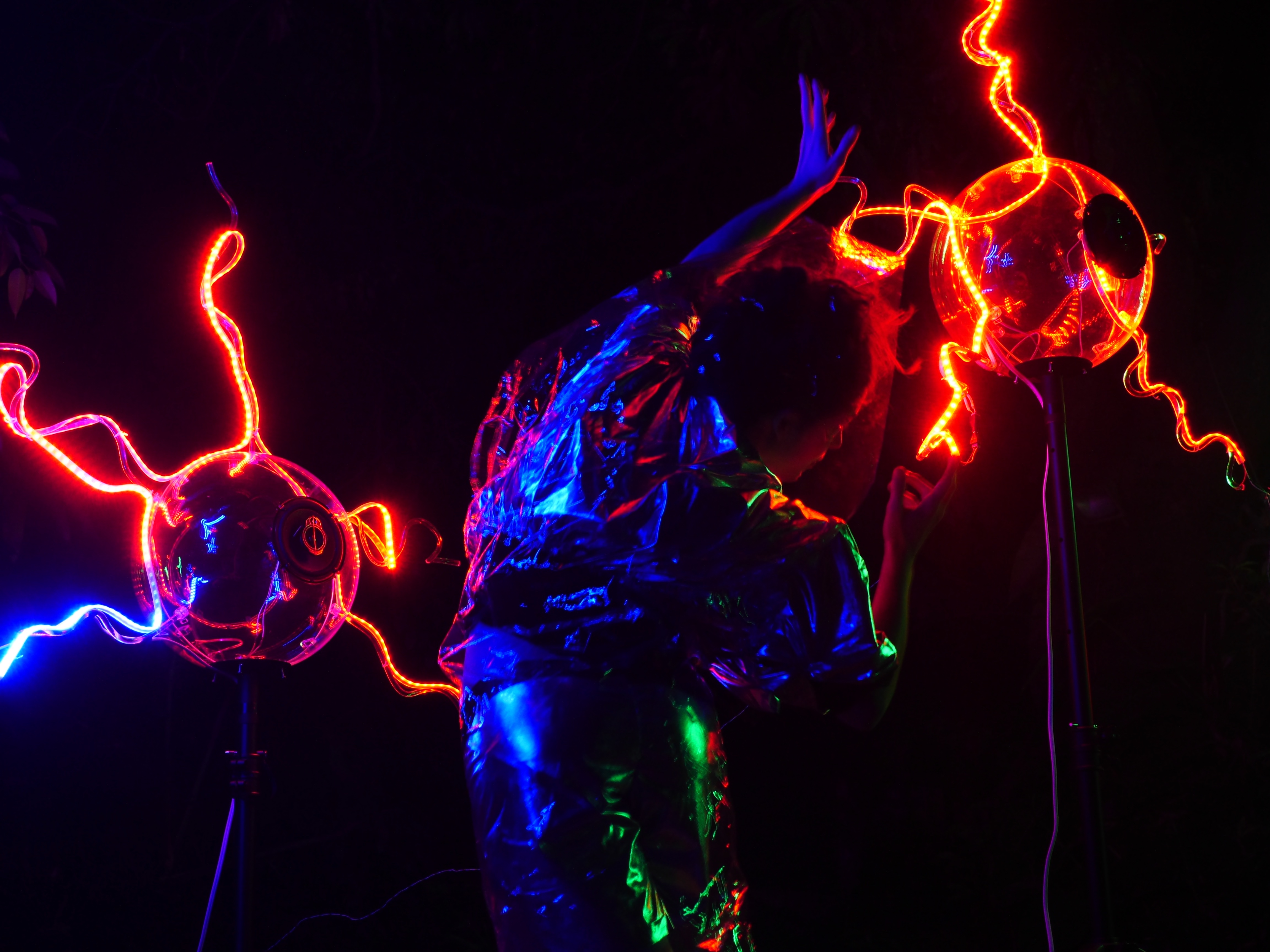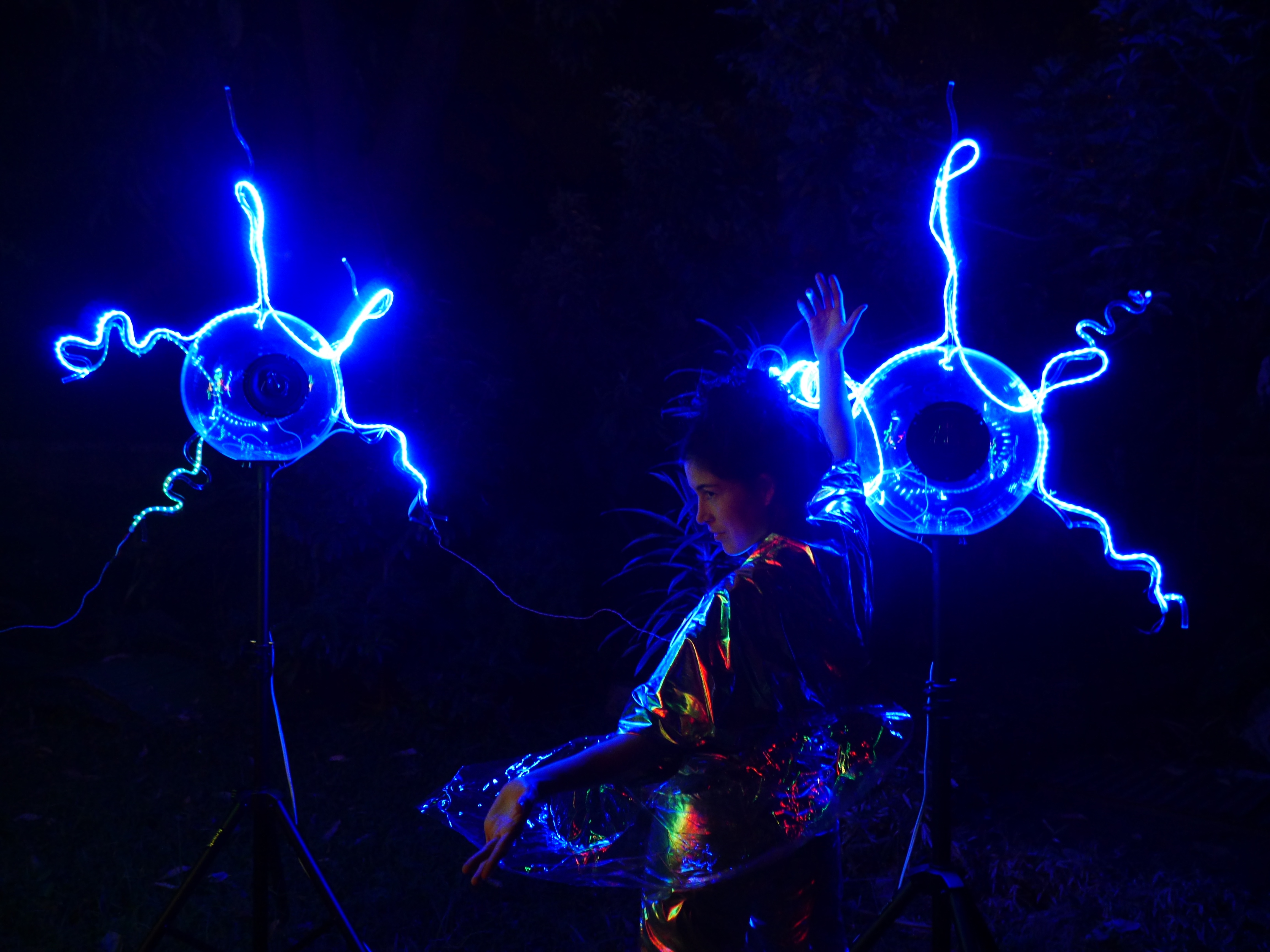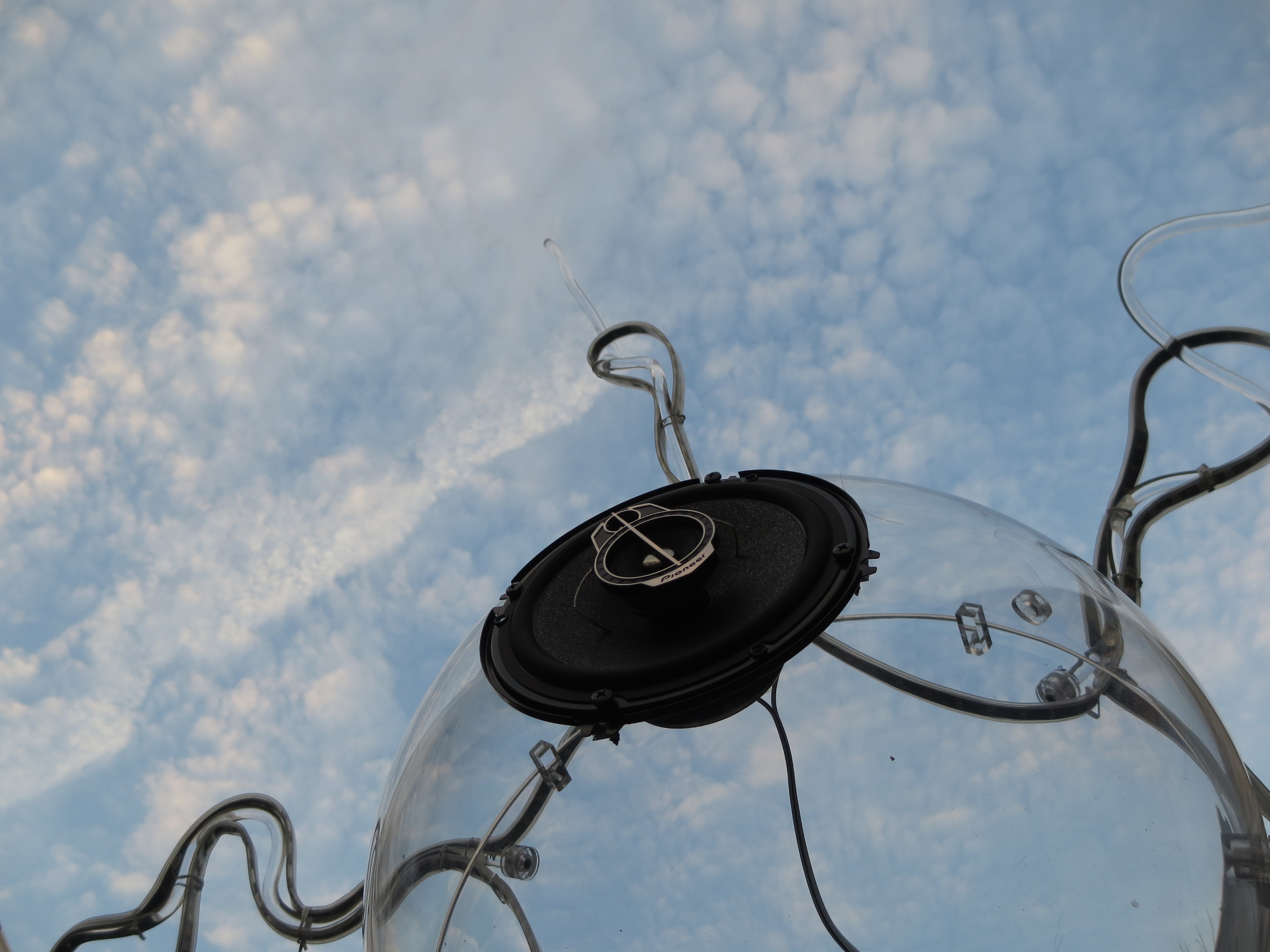 La pieza está conformada por un conjunto de seis bocinas dentro de burbujas de acrílico con tentáculos cubiertos por series de luz LED, se traquea el cuerpo de los participantes con el uso de un Kinect para que puedan modular la luz y el sonido que se reproducen con sus movimientos.